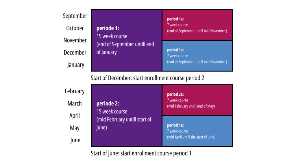 The courses are divided over 2 periods. Each course lasts 15 weeks, and there are also shorter courses that can last from 3 to 10 weeks. Each course description specifies its duration. Many courses conclude with a presentation, held in January and June.